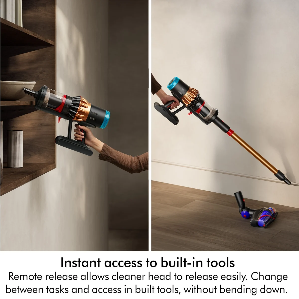 • Release cleaner head easily, without bending down Instant access to built- in tools for multi- purpose cleaning